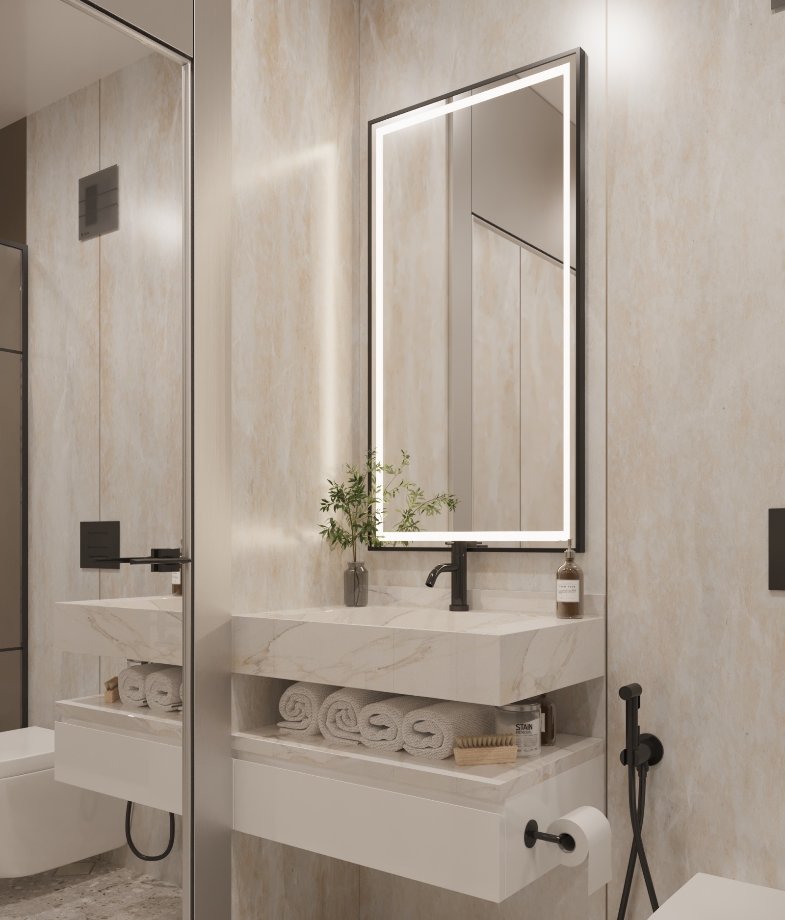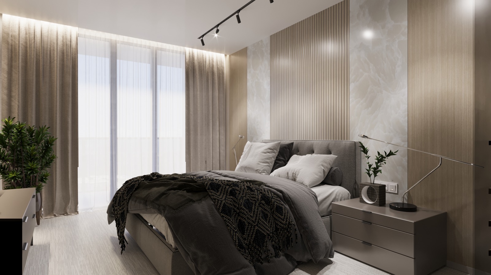 Спалните са обзаведени в изискан дизайн, който включва елементи от мрамор и дърво. Красивата комбинация от нежния мрамор и топлата текстура на дървото придава на пространството изтънченост и уют. Подовата настилка, изработена от нетъкан текстил, придава мекота и комфорт, допълнително засилвайки усещането за уют в спалнята.