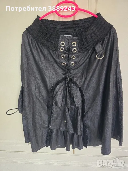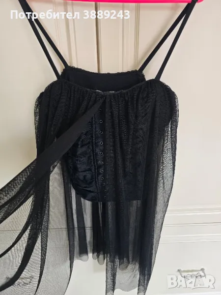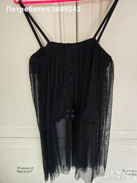 Дамско бюстие с камъни,размер S/ М.Има еластичност, но на гърба е с цип.Черно бюстие с дълъг черен тюл и презрамки,размер М/L.Черна кожена пола размер З8,но има много еластичност и може да е размер L.Черен патур с пайети, размер М/L.Черна сатенена рокля слилаво .размер L.Черно пайетено елече с тюлен гръб,размер S/М.Черно еластично боди дантела,няма закопчаване,облича се като бански.Размер L.Тюлено бюстие тигрови,размер М/L.Черен потник сърце с тюл,размер М/L.Черна сатенена риза,размер М,но е широка.Черна пола с висока талия и тиранти, размер L.