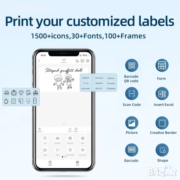 Многофункционално ПРИЛОЖЕНИЕ. Този B1 термо етикетиращ принтер използва мобилно приложение за редактиране, предоставя повече от 30 шрифта/езика, разнообразие от безплатни шаблони, над 100 рамки, различни графики, баркодове, QR кодове за етикети и над 1500 символа. И създавайте свои собствени индивидуални етикети чрез вградената функция. Безжичният етикетиращ принтер поддържа също разпознаване на изображения, пакетен печат в Excel, сканиране и идентифициране на 1/2D код, можете да се насладите на конвертирането на текста от снимките директно в редактируем текст с етикетиращия принтер B1.