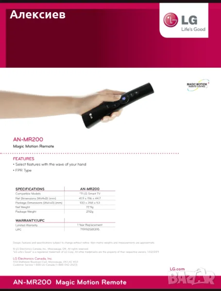 AN-MR200 е дистанционно управление Magic Motion за LG Smart TV от 2011 г., съвместимо с избрани модели от 2011 г.Серии LV3700, LV5400, LV5500, LW5600, LW5700 и LW6500Функционира като дистанционно управление с показалец за навигация в услуги и приложения за смарт телевизори .
