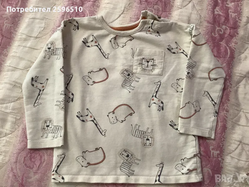 Пижама комплект George за момче, размер 18–24 месеца. Мека и удобна материя с весел принт на животни – жирафи, лъвчета, зебри и хипопотами. Горнището е с копчета на рамото за лесно обличане. Идеална за спокоен сън и уютни вечери. Отлично състояние, без следи от износване.