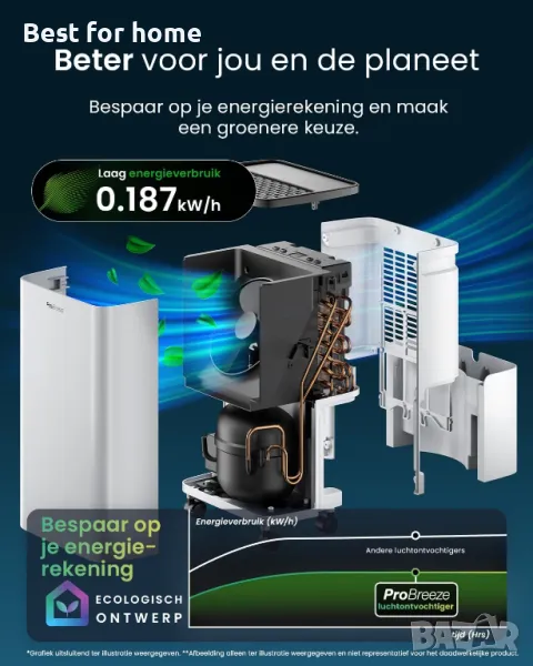 НИСКА КОНСУМАЦИЯ НА ЕНЕРГИЯ - Този енергийно ефективен влагоабсорбатор с капацитет 6 литра/ден от Pro Breeze има мощен компресор, 24-часов таймер за включване/изключване и енергоспестяваща система за автоматично изключване, което ви помага да спестите от сметката си за енергия. Идеален е за влага, черен мухъл, конденз и влага в домовете. Експлоатационни разходи от 3 цента на час.