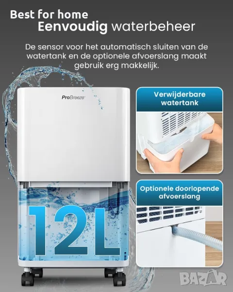Влагоабсорбатор Pro Breeze 12L/ден – резервоар 2L – дисплей за влажност, 3 нива, непрекъснато източване на водата и таймер – премахва мухъл, пари и влага - влагоабсорбатор за дома, гаража и мазето