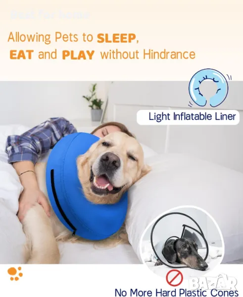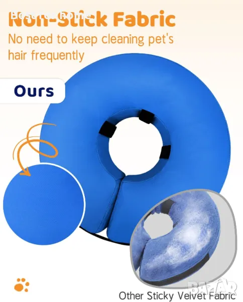 НЕЗАЛЕПВАЩА ПЛАТ - За разлика от други често срещани кадифени надуваеми нашийници за кучета, външната страна на този конус за кучета е изработена от подобрена незалепваща материя, така че няма да се налага често да почиствате козината на домашния любимец. Освен това е лесен за почистване, ако е необходимо, просто разкопчайте ципа, за да свалите външната материя. Следоперативният нашийник за кучета Ecollar осигурява комфорт на кучето ви и дори може да действа като възглавница за врата, която му помага да заспи бързо и да забрави болката от раната.