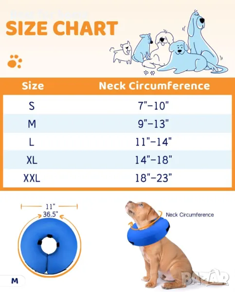 ТОПЛА ПОДСКАЗКА - Ако вашият домашен любимец иска да избяга, когато сложи нашийника за първи път, надяваме се, че можете да работите с кучето си, за да го аклиматизирате. И поради разликите в породите кучета, размерите на тялото и средата на отглеждане, този надуваем нашийник за кучета след операция може да не е подходящ за кучета с дълги муцуни, дълги крака, дълги опашки и дълги тела.