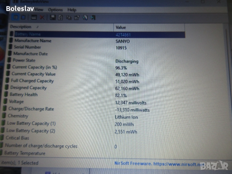 Батерия : отлична оригинална Lenovo батерия на 82% здраве, гарантира 3h автономна работа