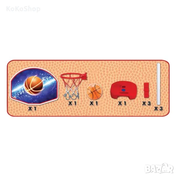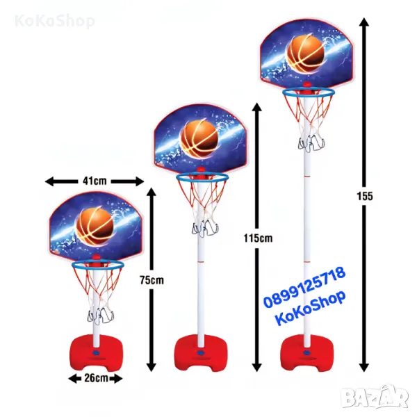 Таблото е с размери 41x33 см, а рингът е с диаметър 19 см. Основата е с размери 26x6x26 см. и трябва да се напълни с вода, за да е стабилна. Височината може да бъде регулирана на 75 см., 115 см. или 155 см. в зависимост от използваните парчета тръба.