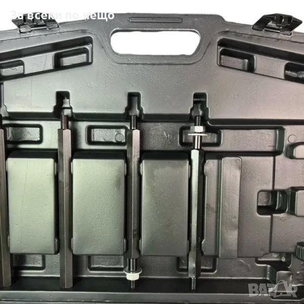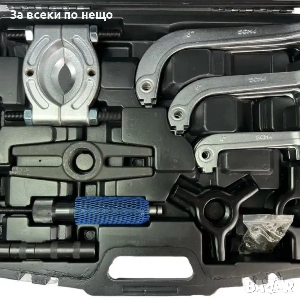 Многофункционален комплект за отстраняване на зъбни колела и лагери. В комплекта са включени сепаратор за лагери и три размера скоби за лагери с три рамена. Подходящ е за широка гама превозни средства.