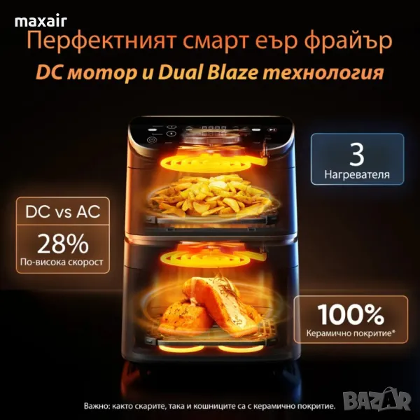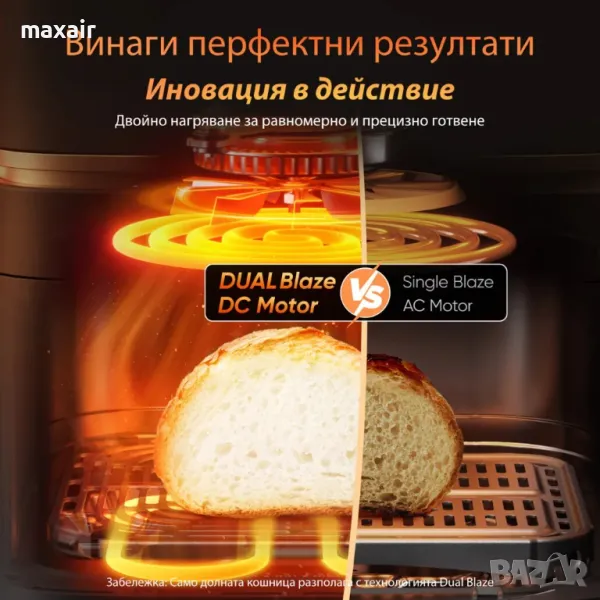Долната кошница разполага с уникални горни и долни нагревателни елементи, както и с два сензора за по-прецизен контрол на температурата. Това гарантира винаги перфектни резултати без нужда от разклащане или обръщане на храната.