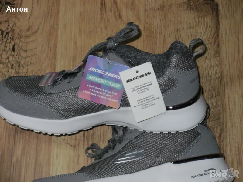 Маратонките са на Skechers, оригинални нови с етикети, лятно моделче. По номер са 36,5 дължина на стелката 23,5см. Цветовете са като на снимките с леко дискретен сребрист ефект, който се забелязва само на светлина. Мемори стелка, много удобно.