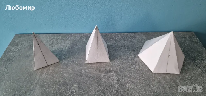 * правилна триъгълна, четириъгълна и шестоъгълна пирамида - 8 см. основен ръб и 13 см. апотема на околната стена