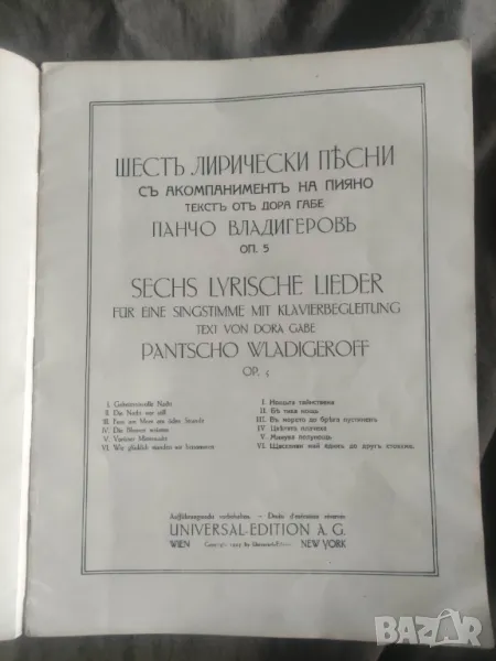 Опус 5 на Пачо Владигеров Шест лирични песни по текст на Дора Габе за висок глас и пиано  , снимка 1 - Други - 50328005 Опус 5 на Пачо Владигеров Шест лирични песни по текст на Дора Габе за висок глас и пиано  , снимка 2 - Други - 50328005 Опус 5 на Пачо Владигеров Шест лирични песни по текст на Дора Габе за висок глас и пиано  , снимка 3 - Други - 50328005 1/3