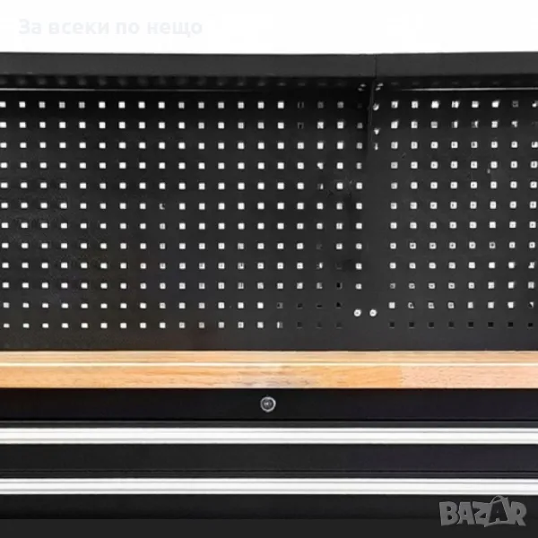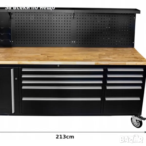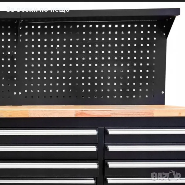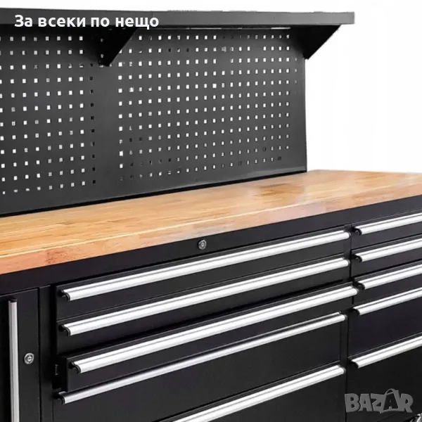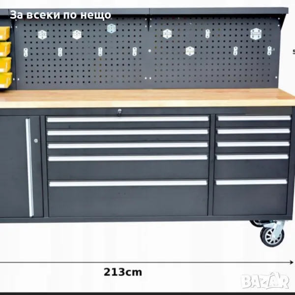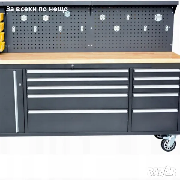Количката разполага с шкаф и 10 чекмеджета (празни) , различни по размер. Има и удобен работен плот и място за закачкали за инструменти.