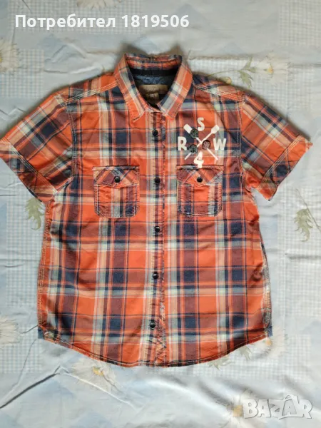 -ризката е от много тънък памучен плат, на бяло, синьо и тъмно оранжево каре, бяла с щампи на гърба, малки джобчета , спортно-елегантна, размери:дължина-58см, ширина на рамене-38см, гръдба обиколка-92см