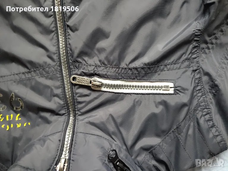 Детско спортно-елегантно яке за момче от много тънък изкуствен плат, с тънка памучна подплата, тъмно сиво на цвят, има качулка, която може да се прибира в яката с цип. Якето е подходящо за пролетно-летен сезон или ранна есен. Много е елегантно и може да се носи както със спортно долнище така и с панталон или дънки, дори с къс крачол.Много е запазено, само от прането малко се е изтрил надписът.