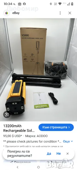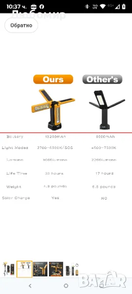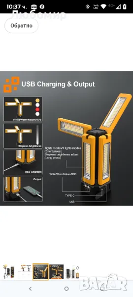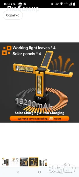 13200mAh акумулаторна соларна работна лампа IP64 водоустойчива със сгъваема стойка и чанта за носене, AODOO 8000 лумена безжична къмпинг лампа, бяла/топла/естествено бяла/червена (SOS) с подвижен статив.Включени 4X 2000 Max Lumens, можете също така да регулирате безстепенно яркостта до желаната от вас яркост. Бяло/Топло/Естествено бяло/Червено (SOS) 4 режима на осветление могат да ви помогнат да се справите с всяка ситуация. Натиснете продължително левия бутон, за да регулирате безстепенно яркостта, натиснете кратко левия бутон, за да превключвате между режими с двойна светлина/4 светлини, натиснете кратко десния бутон, за да превключвате между четири режима: бяла светлина, топла светлина, топла бяла светлина и червено мигане.Високият капацитет от 13200mAh може да работи НАД 15 часа при нормална употреба и НАД 30 часа при най-нисък светлинен поток. Също така може да зарежда вашия телефон или друго електрическо устройство през USB порта. 【ЗАБЕЛЕЖКА】Поради оригиналната батерия с голям капацитет от 13 200mAh в нашата лампа, ще са необходими над 8 часа, за да се зареди напълно, когато батерията е изтощена. Моля, бъдете търпеливи.Нашата работна лампа е с водоустойчивост IP64, което осигурява пълна защита от прах и устойчивост на водни пръски от всяка посока. Перфектна за употреба на открито, тя гарантира издръжливост и надеждна работа в трудни условия. С четири светодиодни глави, те осигуряват по-добро покритие на осветлението. С възможност за вертикално завъртане на 180° и хоризонтално на 270°, могат да осветят всеки ъгъл, който пожелаете.