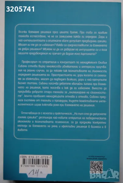 Всички вземаме решения през цялото време. При това го правим толкова естествено, че не се замисляме какво ги определя. Дори и най-интелигентните и опитните обаче допускат предвидими грешки. Могат ли те да се избегнат? Какви са предпоставките за вземането на добри решения? Можем ли да се доверим на интуицията си и кога нашите предубеждения ни пречат да видим ясно картината?