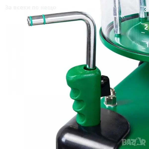 Уредът е оборудван и с прозрачна мерителна колба за оценка на състоянието на източеното масло. Сгъстеният въздух се използва като източник на енергия за извършване на всички функции, включително източване на маслото от масления резервоар на уреда, което гарантира безопасна работа, екологичност и ниска консумация на енергия.