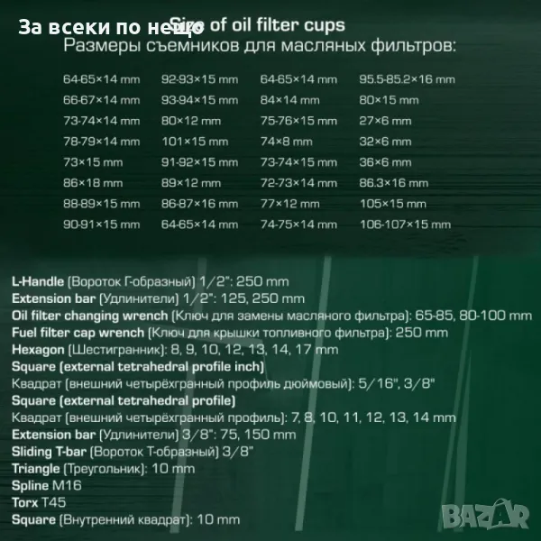 "Капак" за издърпване на маслен филтър: 64 - 65 мм x 14 гр, 66 - 67 мм x 14 гр, 73 - 74 мм x 14 гр, 64 - 65 мм x 14 гр, 73 мм x 15 гр, 86 мм x 18 гр, 88 - 89 мм x 15 гр, 88 - 89 мм x 15 гр, 90 - 91 мм x 15 гр, 92 - 93 мм x 15 гр, 93 - 94 мм x 15 гр, 80 мм x 12 гр, 101 мм x 15 гр, 89 мм x 12гр, 86 - 87 мм x 16 гр, 64 - 65 мм x 14 гр, 64 - 65 мм x 14 гр, 84 мм x 14 гр, 75 - 76 мм x 15 гр, 74 мм x 8 гр, 73 - 74 мм x 15 гр, 72 - 73 мм x 15 гр, 77 мм x 12 гр, 74 - 75 мм x 14 гр, 95.5 - 85.2 мм x 16 гр, 80 мм x 15 гр, 27 мм x 6 гр, 32 мм x 6 гр, 36 мм x 6 гр, 86.3 мм x 16 гр, 105 мм x 15 гр, 106 - 107 мм x 15 гр