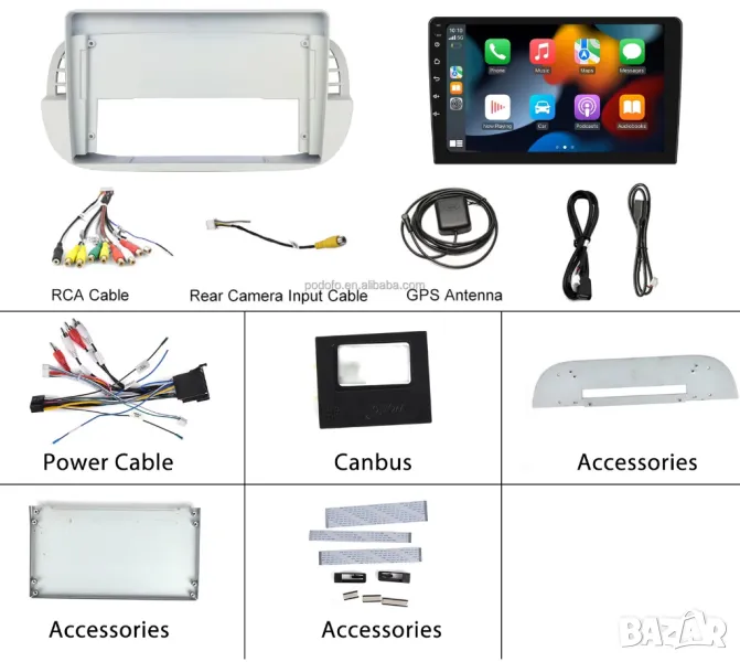 Пълен комплект с цялата рамка, преходни кабели и букси, декодери, предназначени и съвместими за монтиране на конкретния модел автомобил.