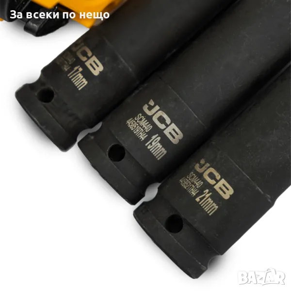 Пневматичен ударен гайковерт в комплект с 3 вложки с двоен чук за тежко натоварване 1/2″ JCB RP9510 KIT. Олекотен и мощен с максимален въртящ момент от 1450Nm. За непрекъсната работа по упорити съединителни елементи. Гумирано покритие на ръкохватката. Комплектът съдържа 3 броя удължени ударни вложки с размери : 17 мм , 19 мм , 21 мм.