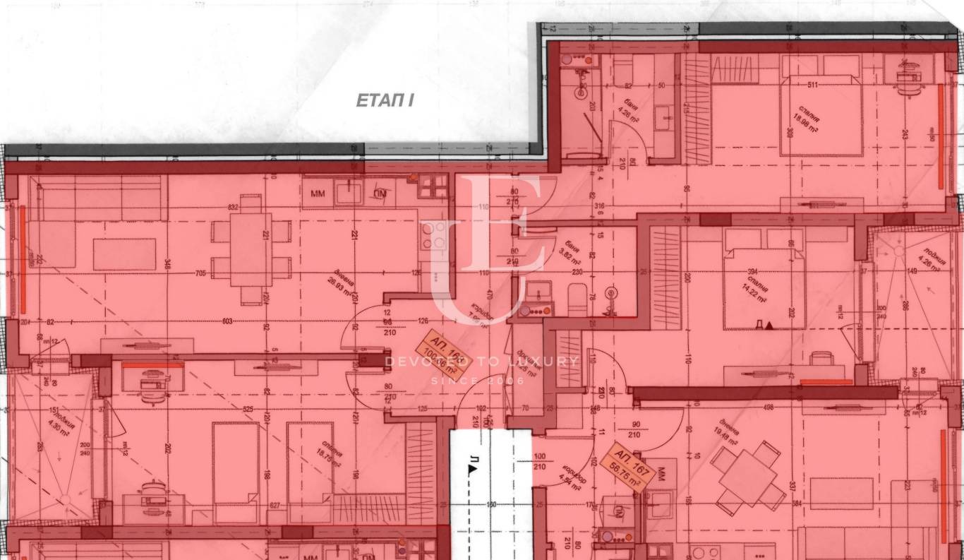 Жилището е с обща площ от 118 кв.м. и предлага функционално разпределение: просторна дневна с кухненски бокс (27 кв.м.), две големи спални (по 19 кв.м.), две бани с тоалетна и тераса. Към имота има възможност за закупуване на двоен гараж на цена от 55 000 Е.