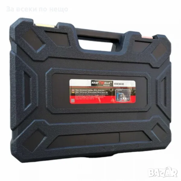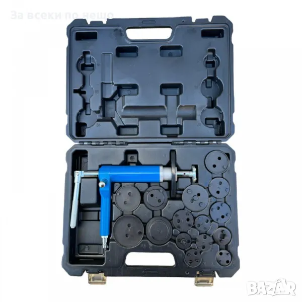 Пневматичен комплект инструменти за спирачни апарати от 16 части. Комплект инструменти за връщане в изходно положение на спирачното бутало на дискови спирачни уредби. Комплектът се състои от пневматичен цилиндър, с който се връща буталото и комплект адаптери за всички модели европейски и японски автомобили