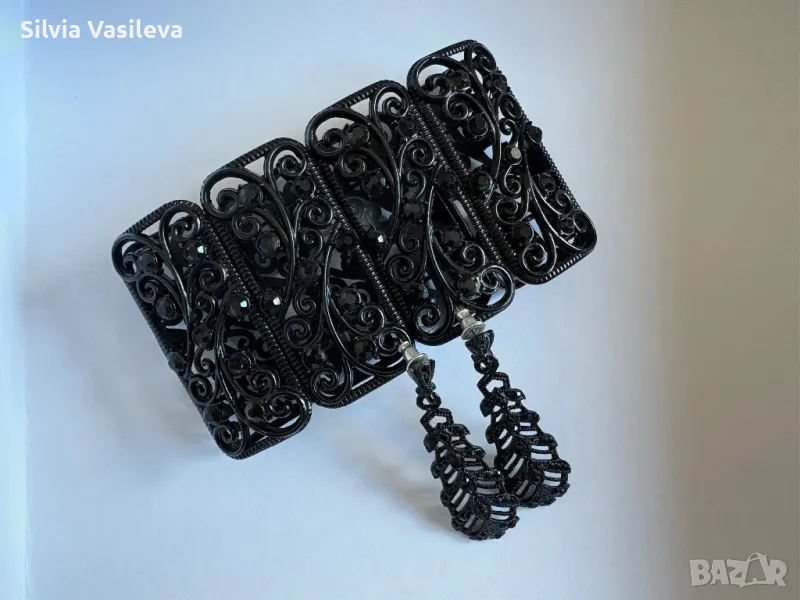Комплект бижута гривна и обици. Черен цвят, винтидж стил.