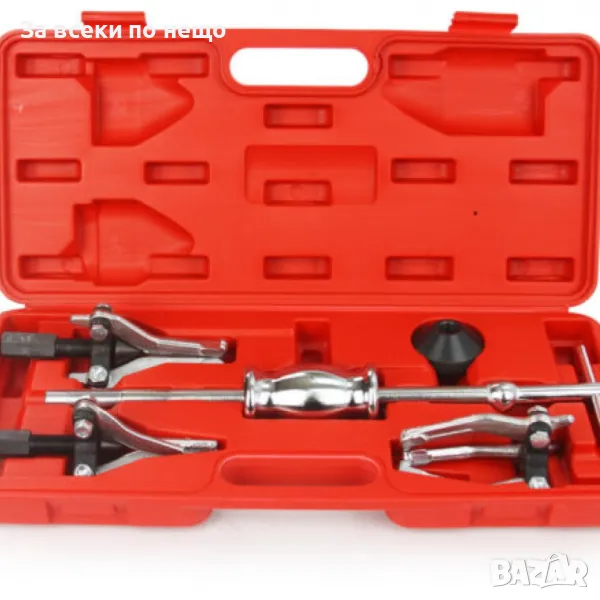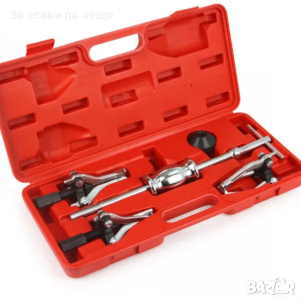 Обратен чук и комплект скоби с три рамена за демонтаж на вътрешни и външни лагери се използват по следния начин: първо, се блокира гайката, за да се отворят челюстите, а след това се закрепва лагерът. Накрая се използва обратният чук, за да се издърпа лагерът.
