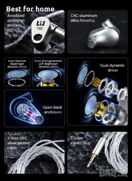 8-милиметров динамичен драйвер с LCP диафрагма от трето поколение: Според акустичния дизайн на TRI, 6-милиметровият динамичен драйвер с титаниева диафрагма е отговорен за осигуряването на сплотени средни и искрящи високи честоти. За да се осигури постоянство на ниските честоти и по-стабилно и обширно акустично представяне, нискочестотната част се обработва отделно от 8-милиметров динамичен драйвер с LCP диафрагма чрез електронен кросоувър. Това осигурява равномерна плътност на звука между средните и високите честоти и ниските честоти, което води до превъзходно качество на тона.