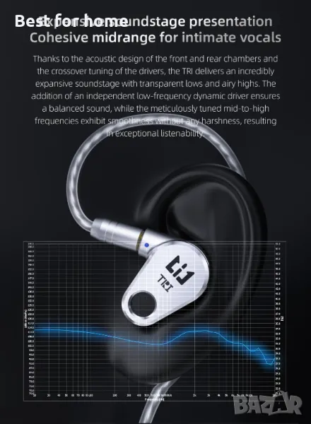 Сплотен среден диапазон за интимни вокали: Благодарение на акустичния дизайн на предните и задните камери и кросоувър настройката на драйверите, TRI осигурява невероятно обширна звукова сцена с прозрачни ниски и ефирни високи честоти. Добавянето на независим нискочестотен динамичен драйвер осигурява балансиран звук, докато щателно настроените средни до високи честоти показват плавност без никаква грубост, което води до изключителна слушаемост.