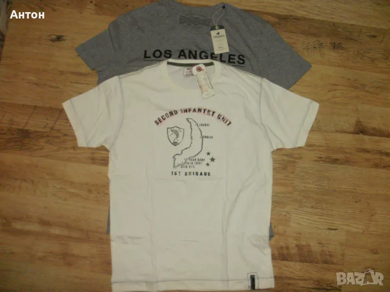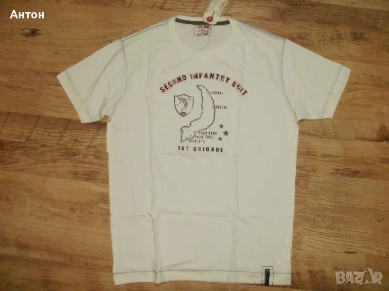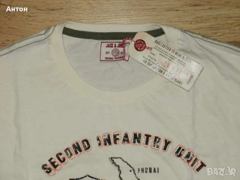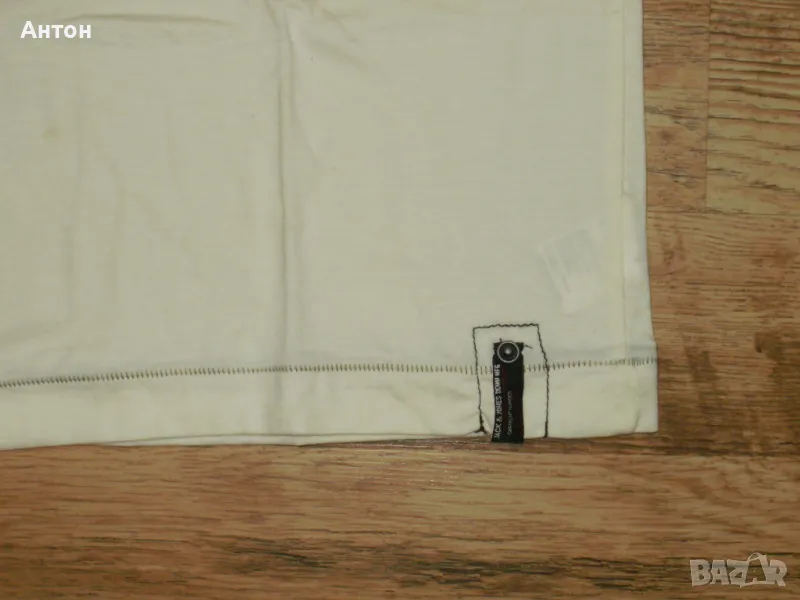 2)Втората тениска е на JACK & JONES, нова с етикет. Цвета е шампанско, картинката е супер. Материята е тънко трико, 100% памук. По номер е М и си отговаря. Дължина-71см. подмишници-52см