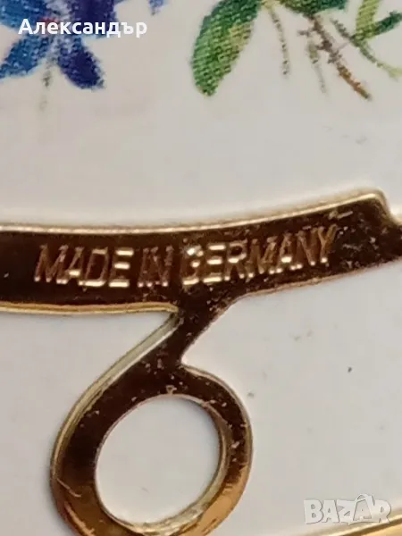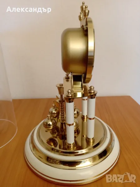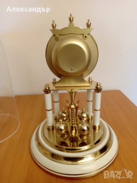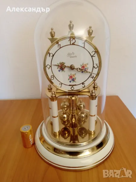 Юбилеен немски кварцов часовник. Уникално красив. Бронз, месинг и емайл. Основа от ПВЦ материал обвита с месинг и емайл. Златни кантове. Колба от пластмаса. Часовникът работи точно, топчетата се въртят. Емайлиран и ръчно рисуван циферблат. Стрелки от бронз. Височина 31 см. Предлага се с нова батерия.