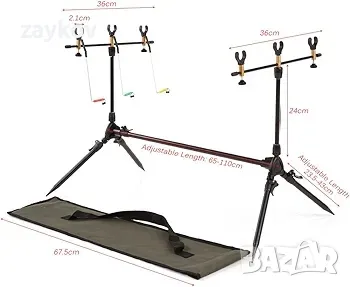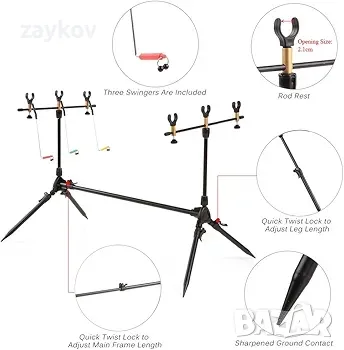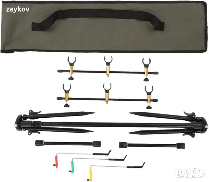 Предлага се с 6 поставки за въдици и 3 люлки. Включена е издръжлива чанта за носене.