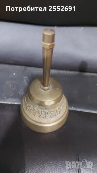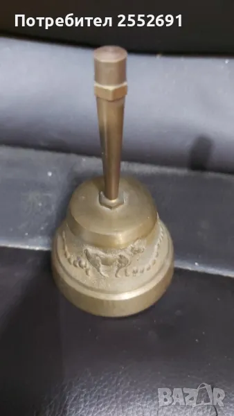 Масивна месингова камбана с дръжка. Височина- 10см. Диаметър на основата- 6см. Наличие на инкрустации и надписи.