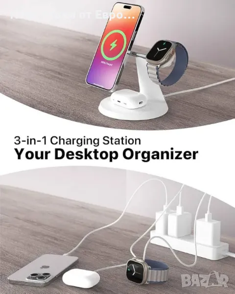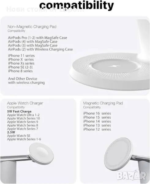 3-в-1 безжична зарядна станция за Apple устройства: Бърза зарядна станция за iPhone и Watch с MagSafe, стабилна зарядна стойка за iPhone 12-16, iWatch и AirPods