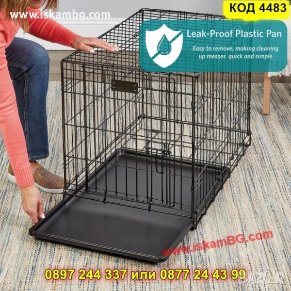 Изработена от здрав метал с антикорозионно покритие, клетката се сгъва и разгъва лесно без нужда от инструменти. Двете вратички – предна и странична – са оборудвани с двойна ключалка за допълнителна сигурност. Вградената пластмасова тава се изважда бързо и лесно, което улеснява почистването и поддържа добра хигиена.