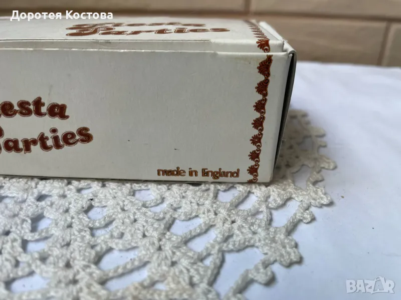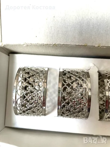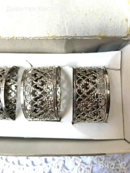 Красиви посребрени пръстени за салфетки от Англия в оригиналната им кутия, 4 бр. Прекрасни и рядко срещани, много нежни. Цена - 40 лв.