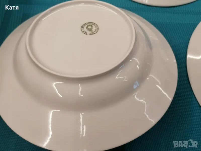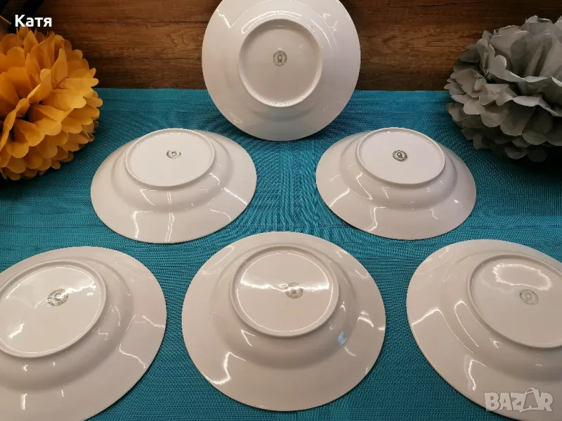Стар български порцелан. Чинии дълбоки 6 бр.Златен кант. Продават се само като комплект. Размерите са на снимките.В отлично състояние. Без наранявания,без следи от употреба.На снимките се вижда. Само едната има производствено балонче показано на последната снимка. Много красив и фин бял порцелан! За повече информация и поръчка на лични съобщения!Пращам само с Еконт