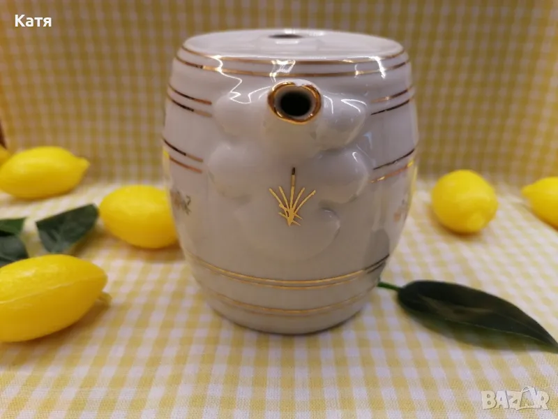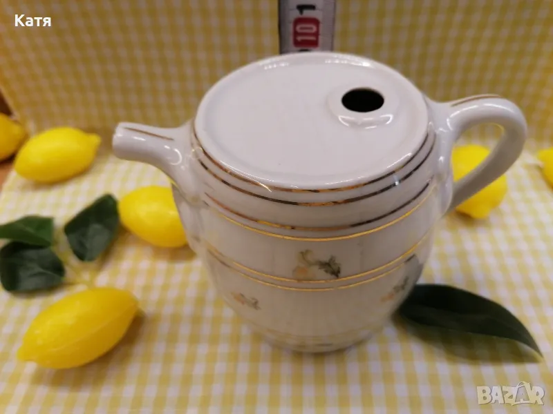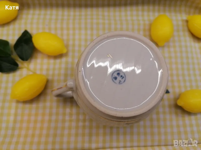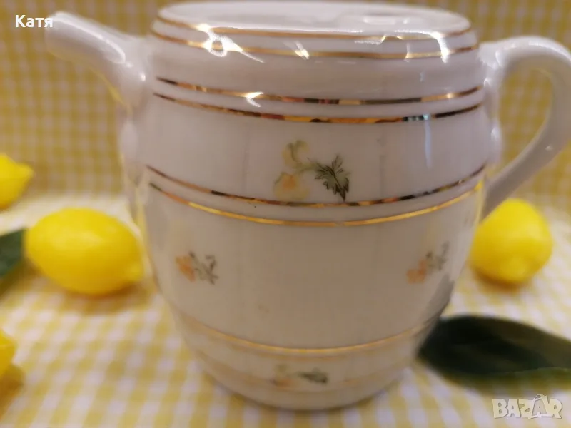 Порцеланово бърдуче от миналоно .Добре запазено. Има много малко чипче на канелката, почти незабележимо Маркирано, златни нишки. Размерите са на снимките, за въпроси пишете. Пращам само с Еконт. За декорация и предназначение