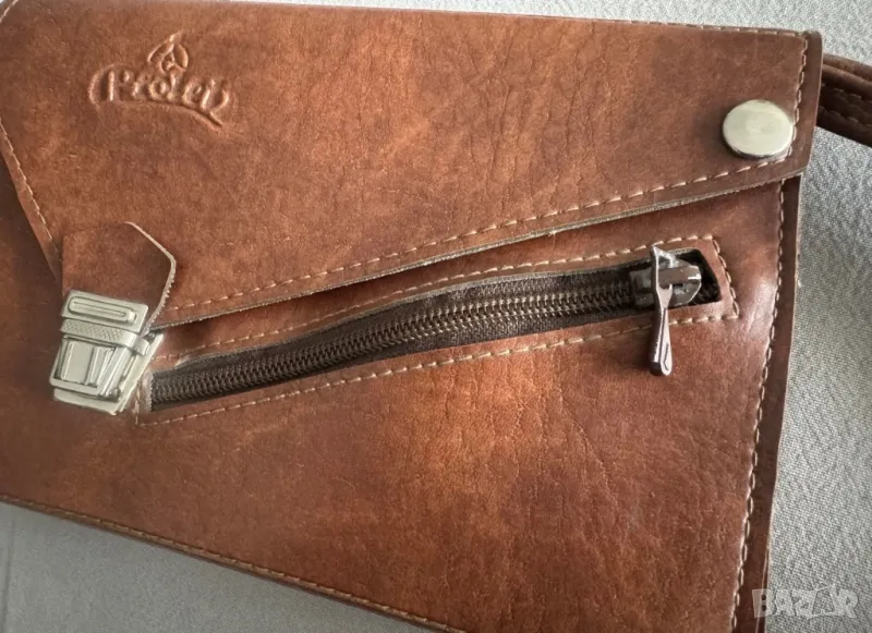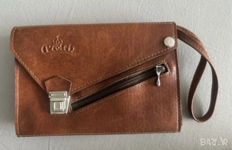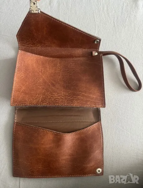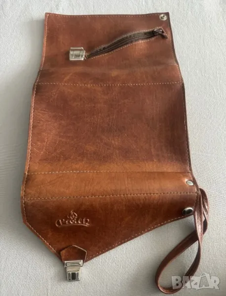 Практична, кафява, кожена, ръчна чантичка. Размери: 22/15 см. Единствената й забележка е едвам забележимо миниатюрно олющване на боята на ципчето, което може да бъде боядисано. Чантичката е в отлично състояние, видно от снимките. С широки, практични отделения.