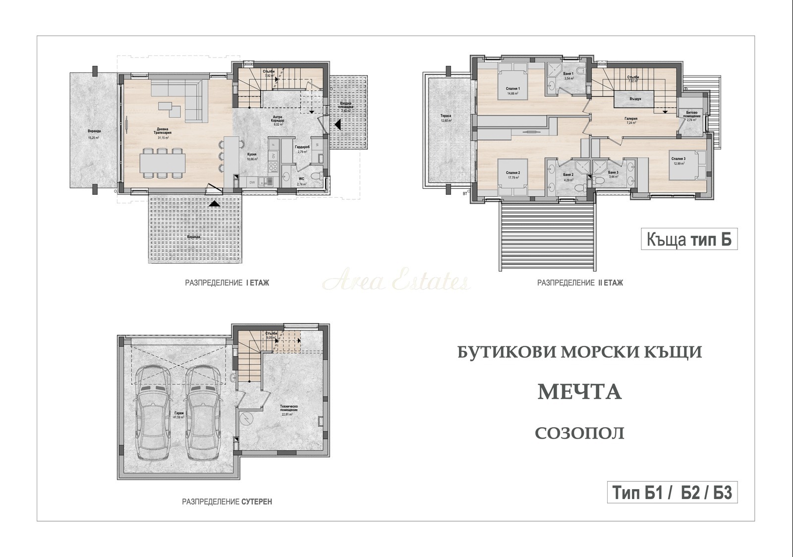 Вила тип Б се предлага с разгърната застроена площ от 286.58 кв.м. и прилежащ терен от 353.9 кв.м.