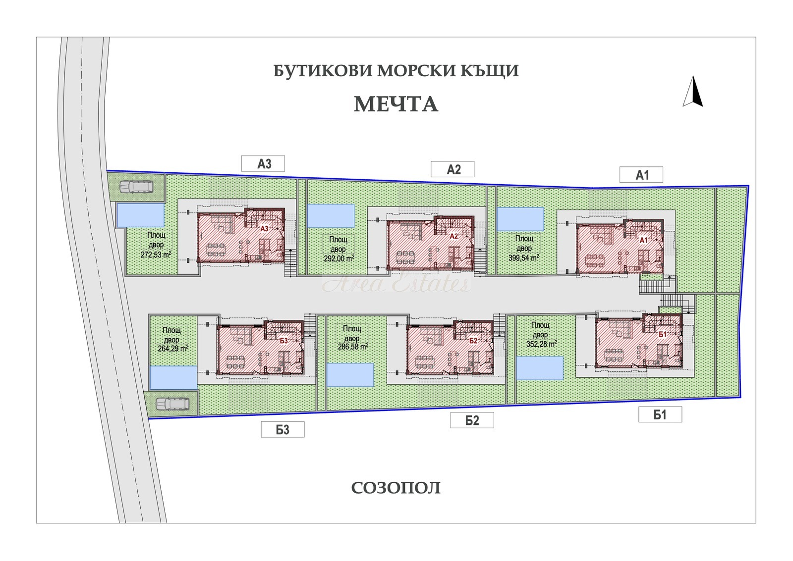 Къщата е част от комплекс, състоящ се от общо 6 разкошни къщи, върху парцели от 353.9кв.м. до 466.34кв.м.