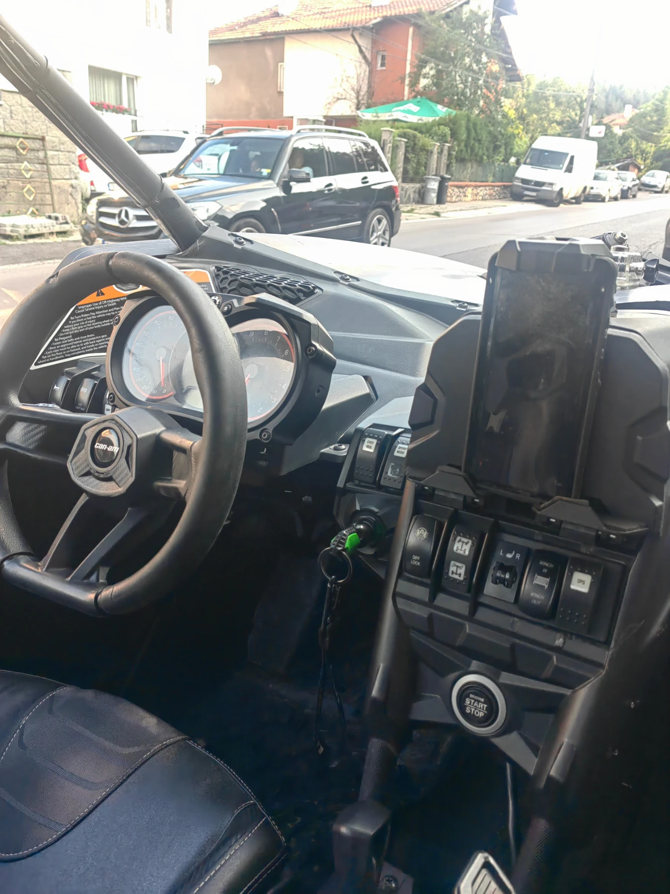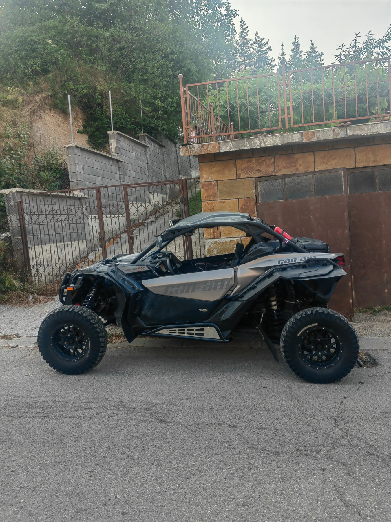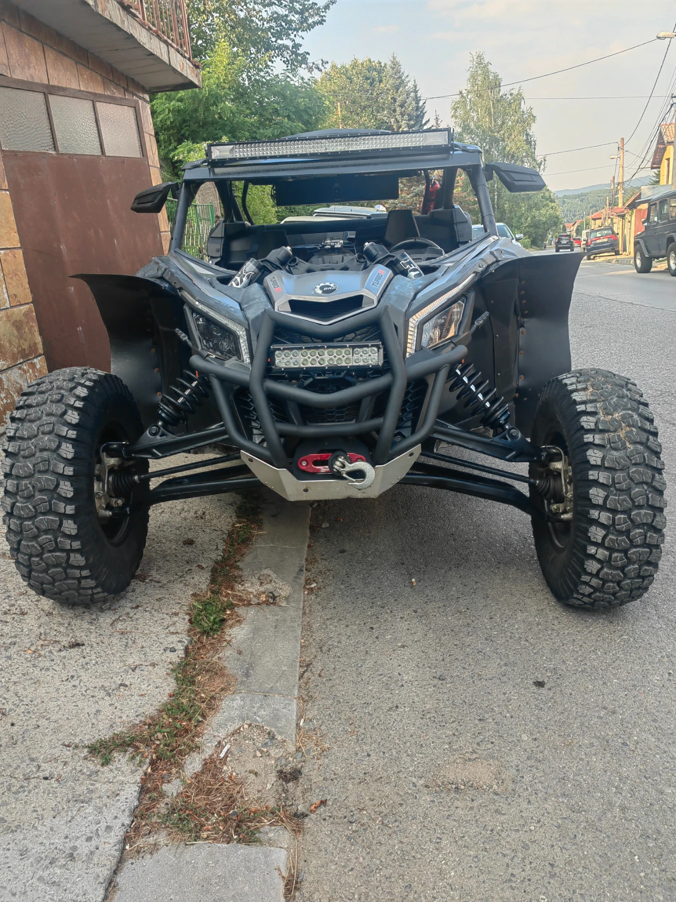 Maverick x3 RS 2019. Вариаторите са ревизирани, сменени са ролките. Ремъка е на 2к км ама ще кара още. Сменени са втулките на предните носачи, амортисьорите са обърнати за по-добро охлаждане. Сложена му е лебедка+броня и лед бар малък. Допълнително голям лед бар и сенник. Rock slider-и. Долна част на вратите, подгрев на седалките, парно (като имаш прозорец) и става доста топло, има и инсталация за чистачка+пръскалка за преден прозорец. Блокаж на преден диференциал. Музика, допълнителна лампа за осветление, чантички на вратите. Защита на кутията на вариаторите като скъса ремък да не прецака самата кутия + бързи връзки за по-бързо отваряне. Стойка за телефон/таблет.