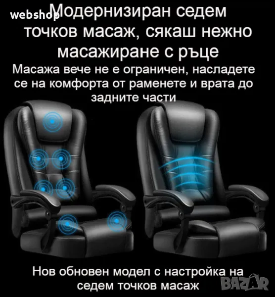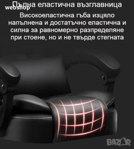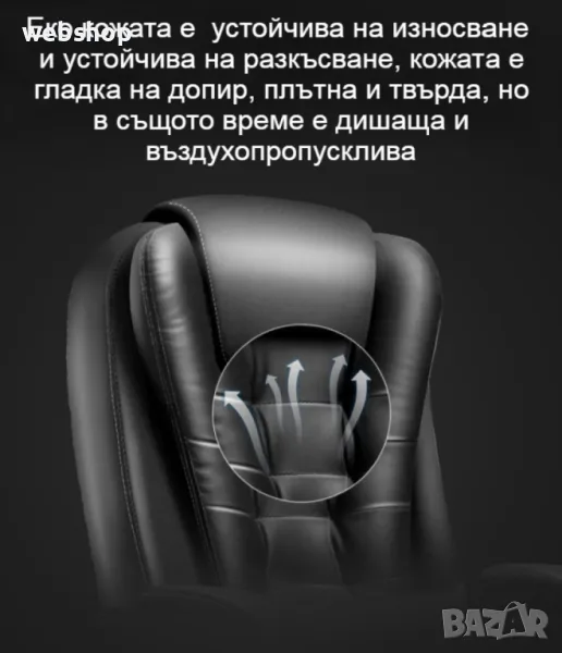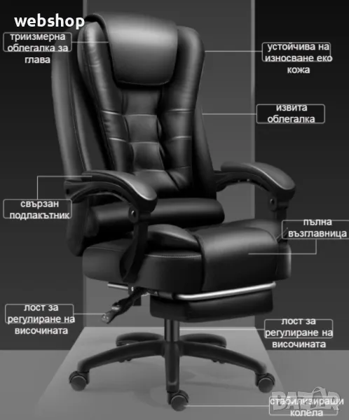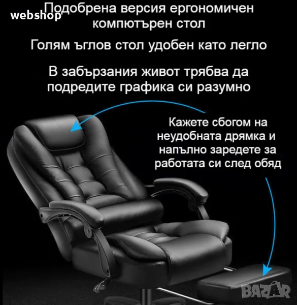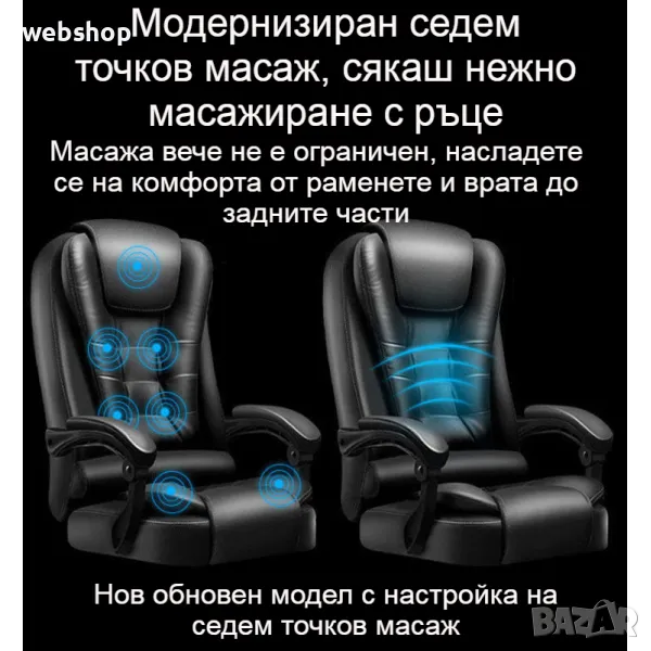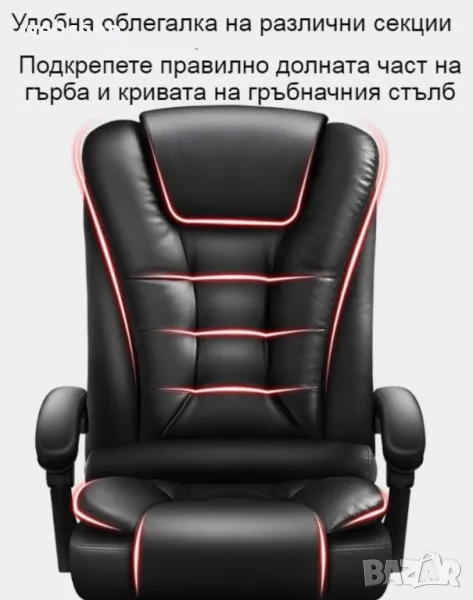 Дизайна на модела е с подобрена версия на този ергономичен компютърен стол. Стола разполага с голям ъгъл на падане и удължение за крака, което го прави много удобен почти като легло, това ни е много нужно особено в забързания живот, в който трябва да подредите графика си разумно. Кажете сбогом на неудобната дрямка и напълно се заредете за работата си след обяд. Режим на използване, има функция за сядане, лежане, суха почивка и отделно безплатен масаж на талията. предизвикай себе си и избери най-доброто качество с увеличени детайли за масаж. Стола разполага с триизмерна облегалка за глава, устойчива на износване еко кожа, извита облегалка, свързан подлакътник, пълна възглавница, лост за регулиране на височината, повдигащ въздушен прът и стабилизиращи колела. Еко кожата от която е изработен модел освен, че устойчива на износване тя е и устойчива на разкъсване, кожата е гладка на допир, плътна и твърда, но в същото време е дишаща и въздухопропусклива. Триизмерната облегалка за глава предпазва врата, винаги поддържайте врата, грижете се за натиска и се облегнете назад, когато сте уморени. Удобната облегалка с различни секции подкрепя правилно долната част на гърба и кривата на гръбначния стълб. Подлакътникът за ръце се състои от едно цяло парче, а ъгълът му се променя спрямо ъгъла на облегалката, също така е обвит с меки части, за да поддържа двете ръце. Подлакътникът е здраво закрепен в три точки, така че може да седнете удобно. Меката обвивка от гъба на подлакътника удобно поддържа ръцете ви. Възглавница с високоеластична гъба изцяло запълнена и достатъчно еластична и силна за равномерно разпределяне при стоене, но и не твърде стегната. Подложката за крака е много удобна, тя е с подпори от стоманени тръби, стабилна и здрава, лесна за достъп, удобна за разширяване и свиване, лесна за бутане и изтегляне. Удебелена подсилена подложка и сертифициран прът за въздушно налягане, двойна гаранция за повече спокойствие, с дълъг експлоатационен живот. Пет на брой пръти близо до земята, за да държат здраво тежестта, материала е противостареещ, силно носещ и с голяма стабилност, а универсалните найлонови ролки предпазват пода от драскотини, докато се плъзгат гладко.