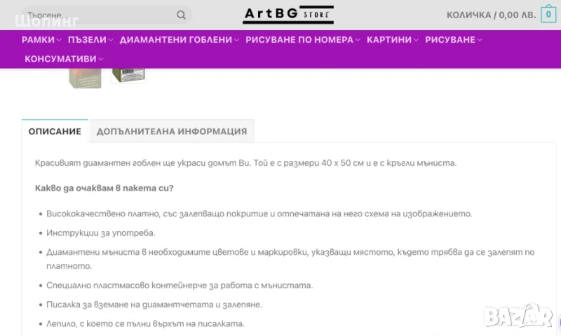 За поставянето на камъчетата върху картината не е необходимо лепило. Всяка картина от серията пристига, покрита със слой лепило - когато поставяте декоративните камъчета, трябва само прецизно да ги наместите с помощта на апликатора или пинцета и леко да ги натиснете.;