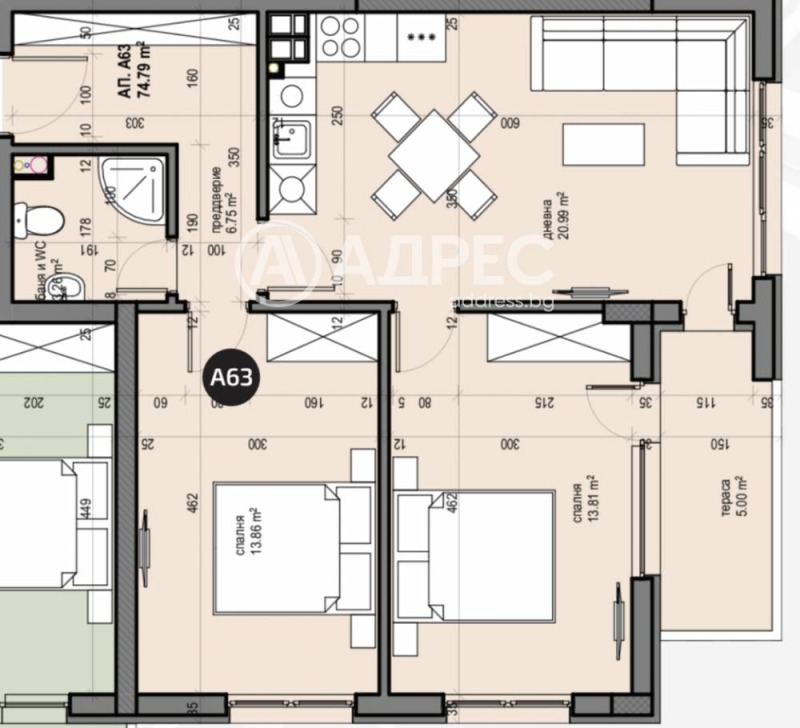 Тристаен апартамент състоящ се от дневна с кухненески бокс, баня с тоалетна, две спални и тераса.