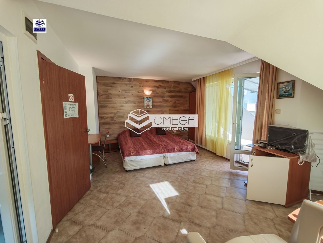 - Студиата са с площ от 30кв.м и разполагат с: две легла, разтегателен диван, бюро, стол, минибар, сейф, тв, климатик, баня с тоалетна.