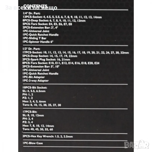 17 х Накрайници (30L): SL8, 10, 12, T40, 45, 50, 55, 60, PH3, 4, PZ3, 4 HEX, 7, 8, 10, 12, 14 мм
