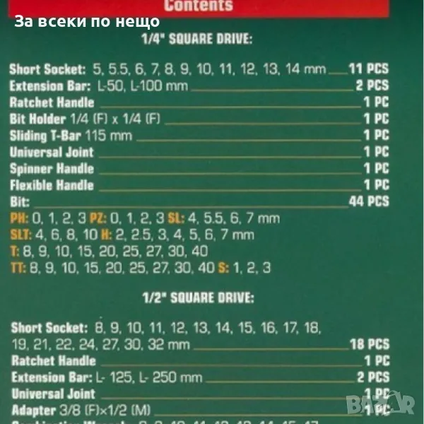 Професионален комплект 110 части на марката RockForce 1/2" и 1/4", изработен от хром - ванадиева стомана.